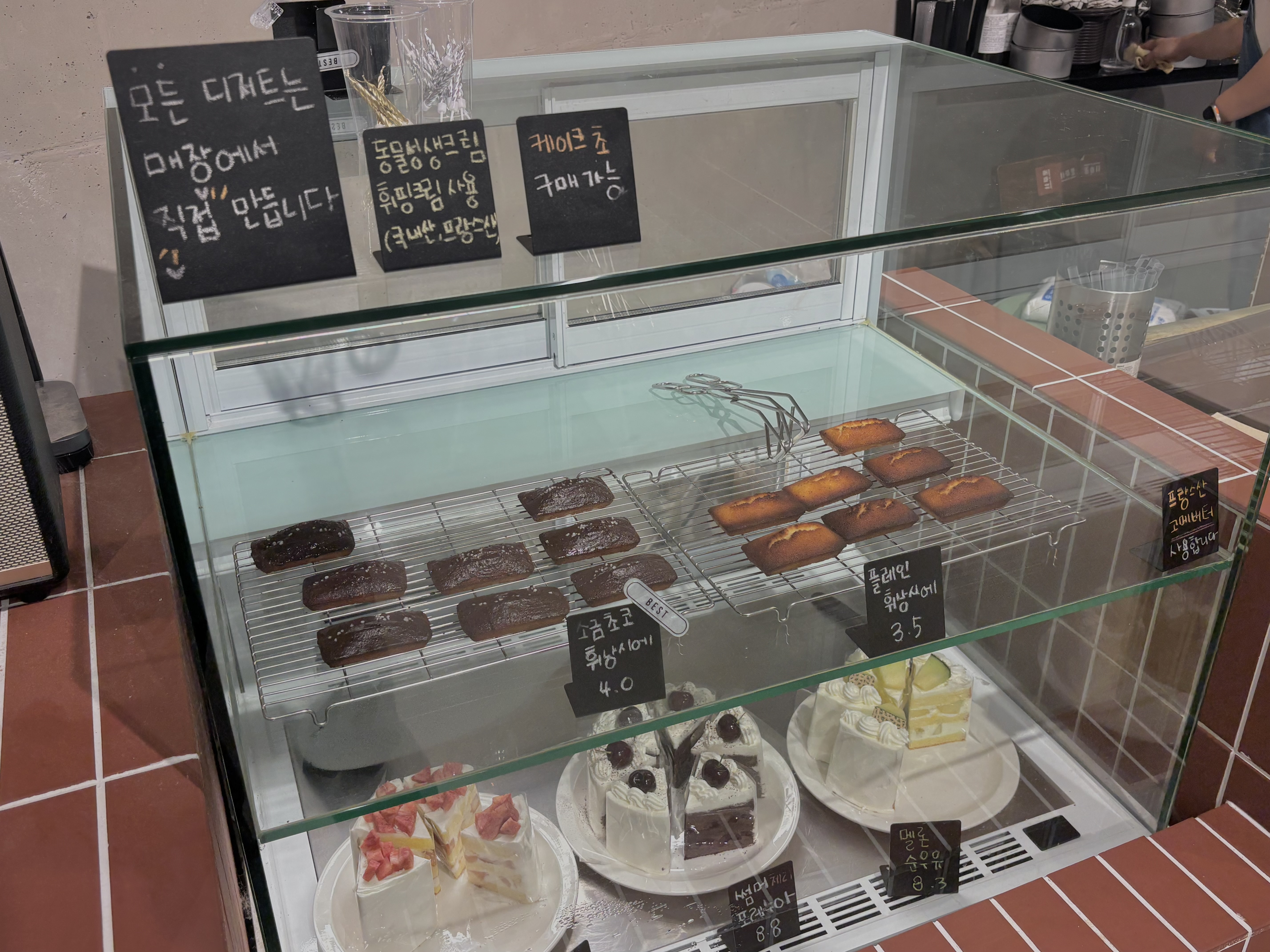 쇼케이스에는 매일 신선하게 만든 케이크와 구움 과자들이 진열되어 있었어요.