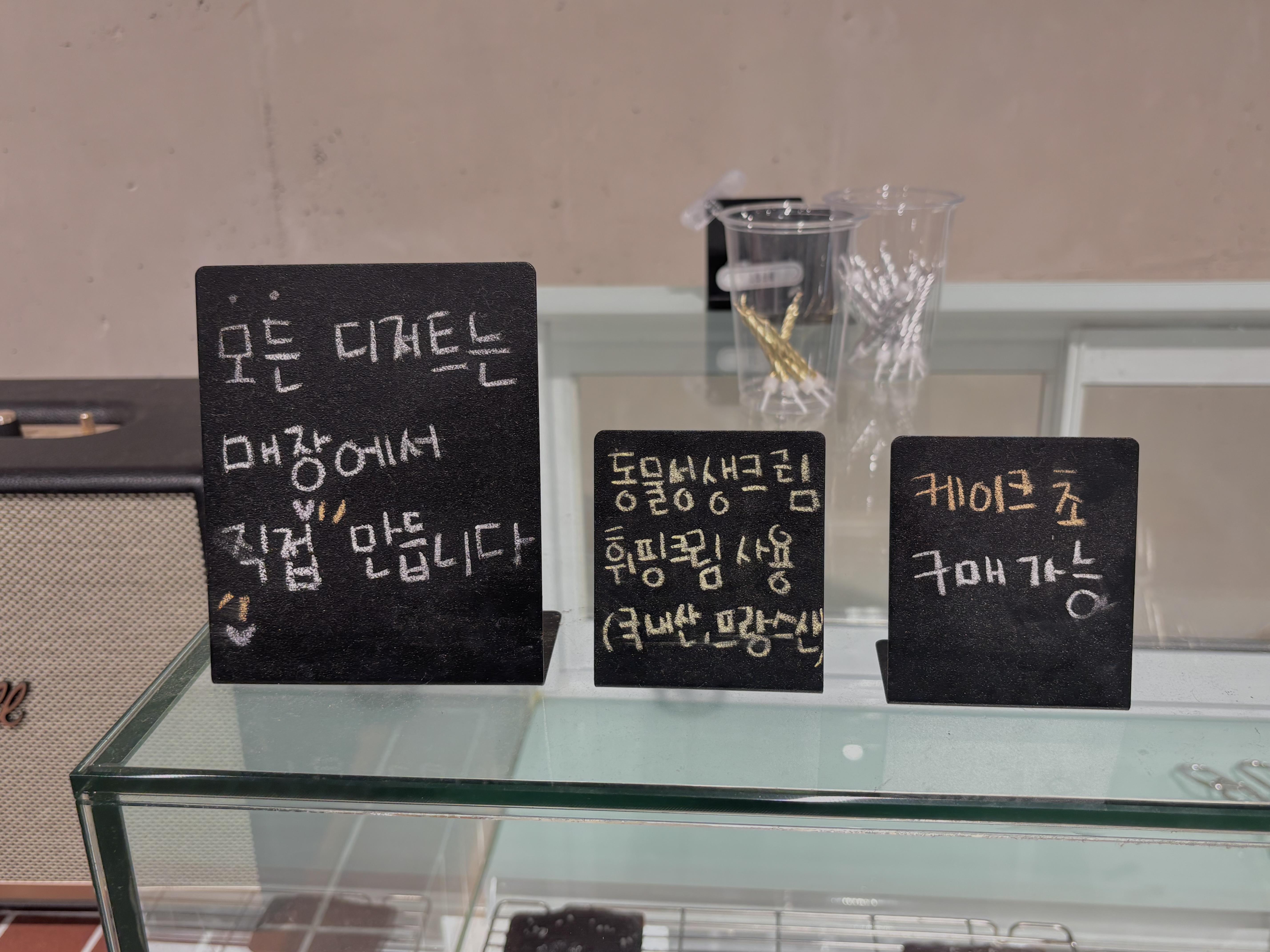 쇼케이스에는 매일 신선하게 만든 케이크와 구움 과자들이 진열되어 있었어요.