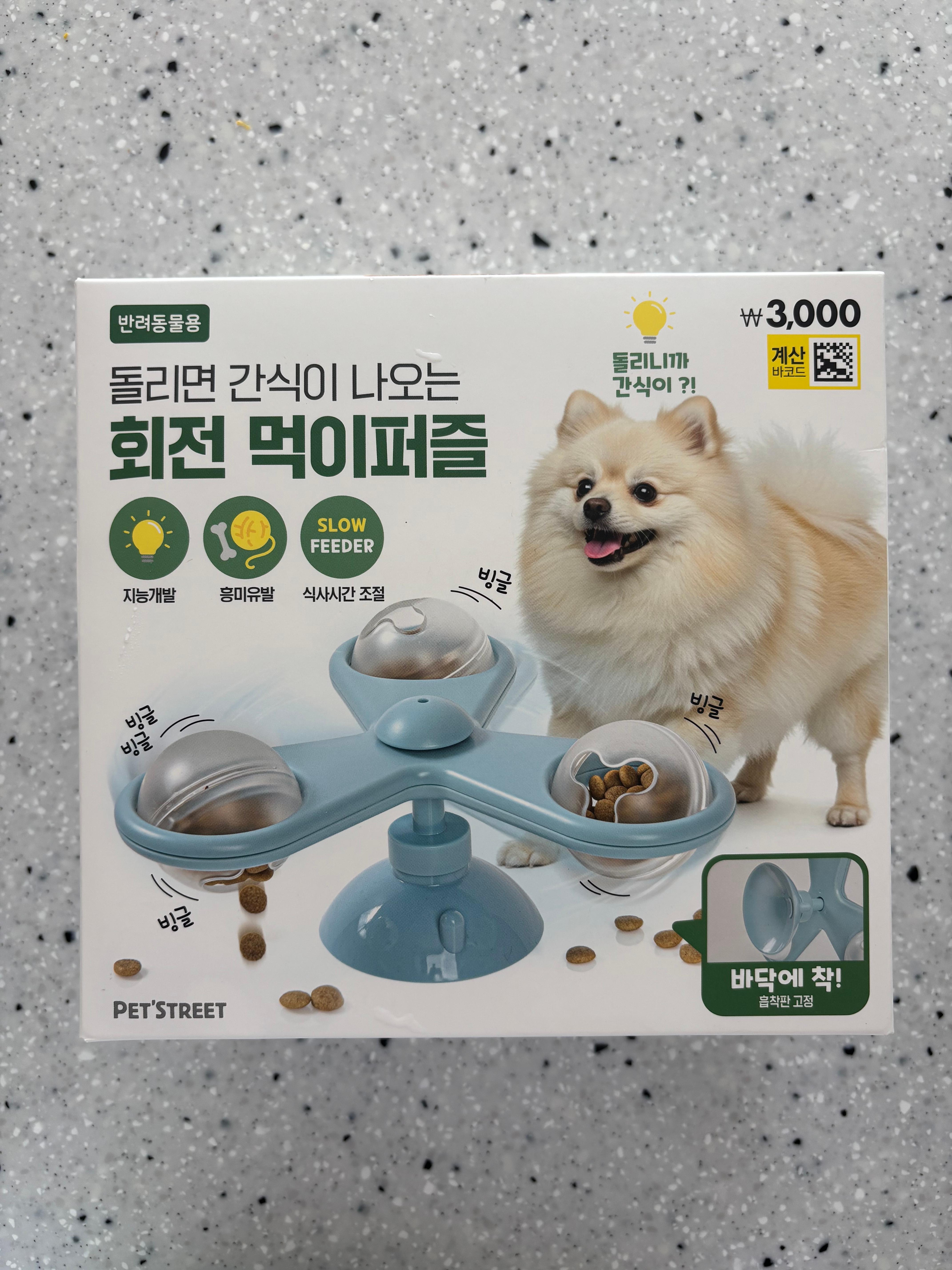 바로 돌리면 간식이 나오는 회전 먹이퍼즐입니다. 가격도 단돈 3,000원이라 부담 없이 구입할 수 있었어요.