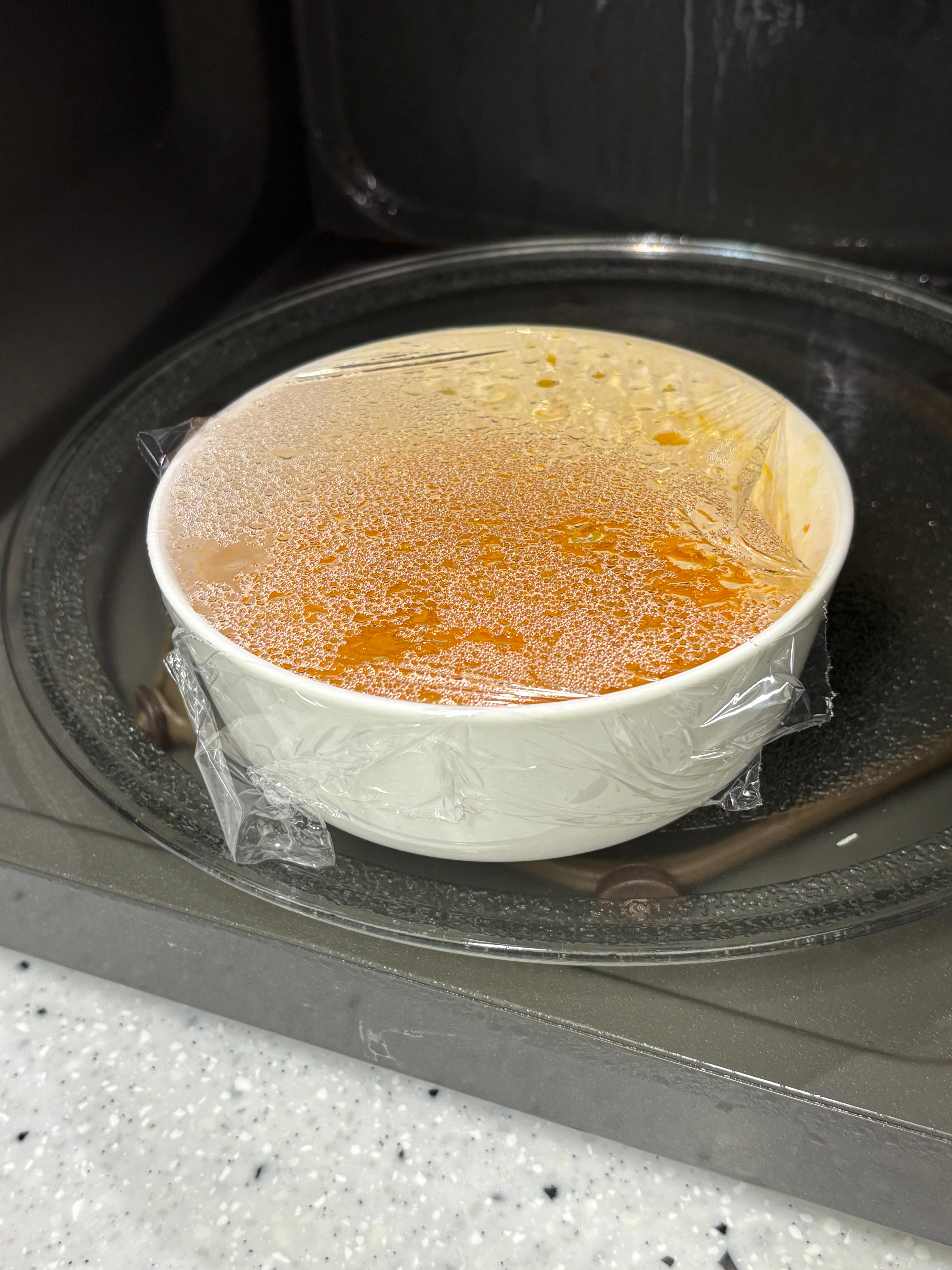 그릇에 랩을 씌워 전자레인지 3~5분 익혀 부드럽게 만들어줍니다.