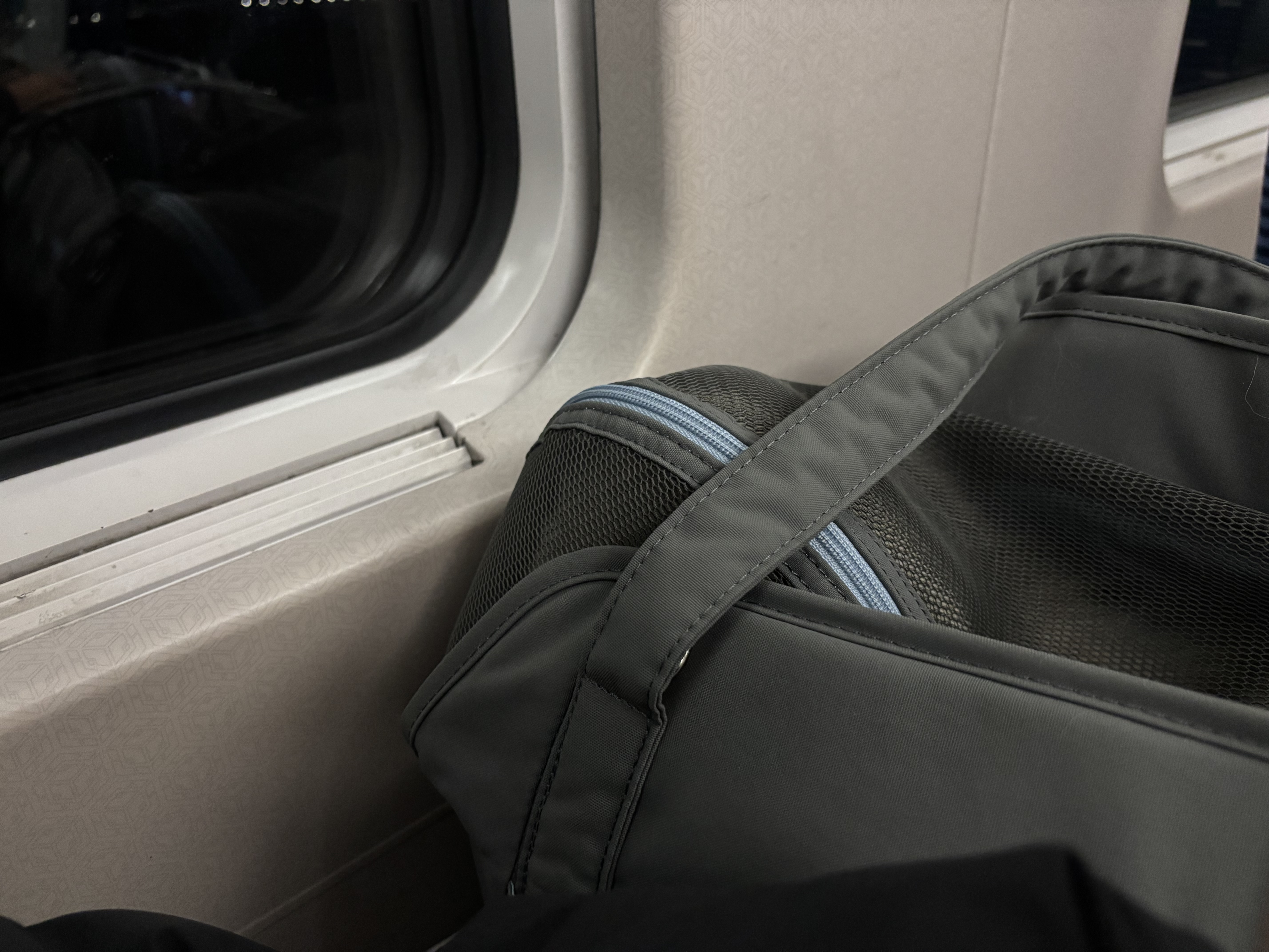 야간 KTX라 사람이 많지 않아 쾌적했고, 처음엔 제 발밑에 가방을 두었는데 KTX 진동 + 히터 열기에 헥헥거리길래 곧바로 무릎 위로 이동가방을 올려 이동했어요.