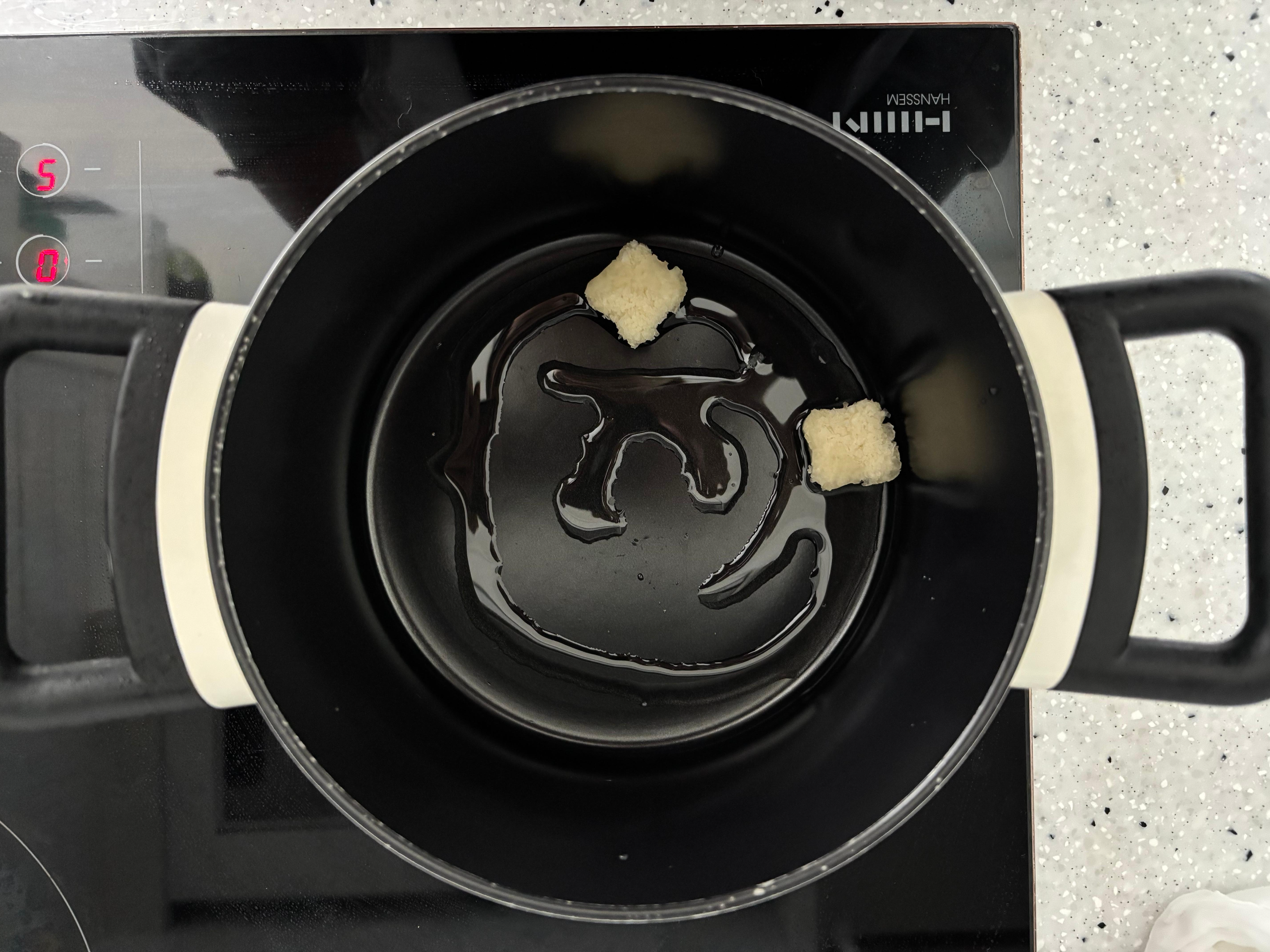 냄비에 기름을 두르고 다진 마늘 큐브 2개를 넣어요.