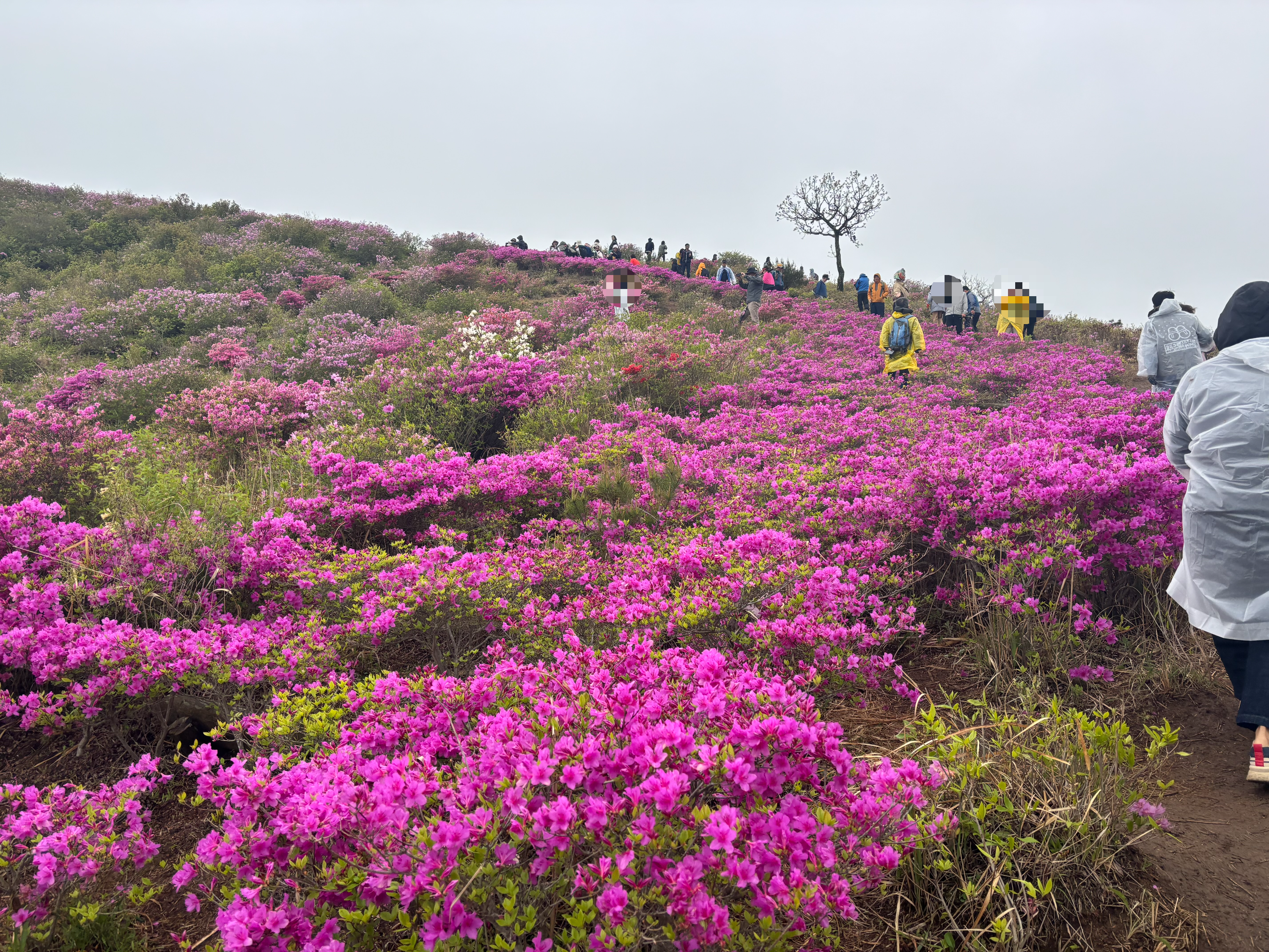 비 오는 날 방문했지만, 흐린 하늘과 철쭉의 선명한 색이 오히려 조화를 이루며 더 드라마틱한 풍경을 만들어줬어요.