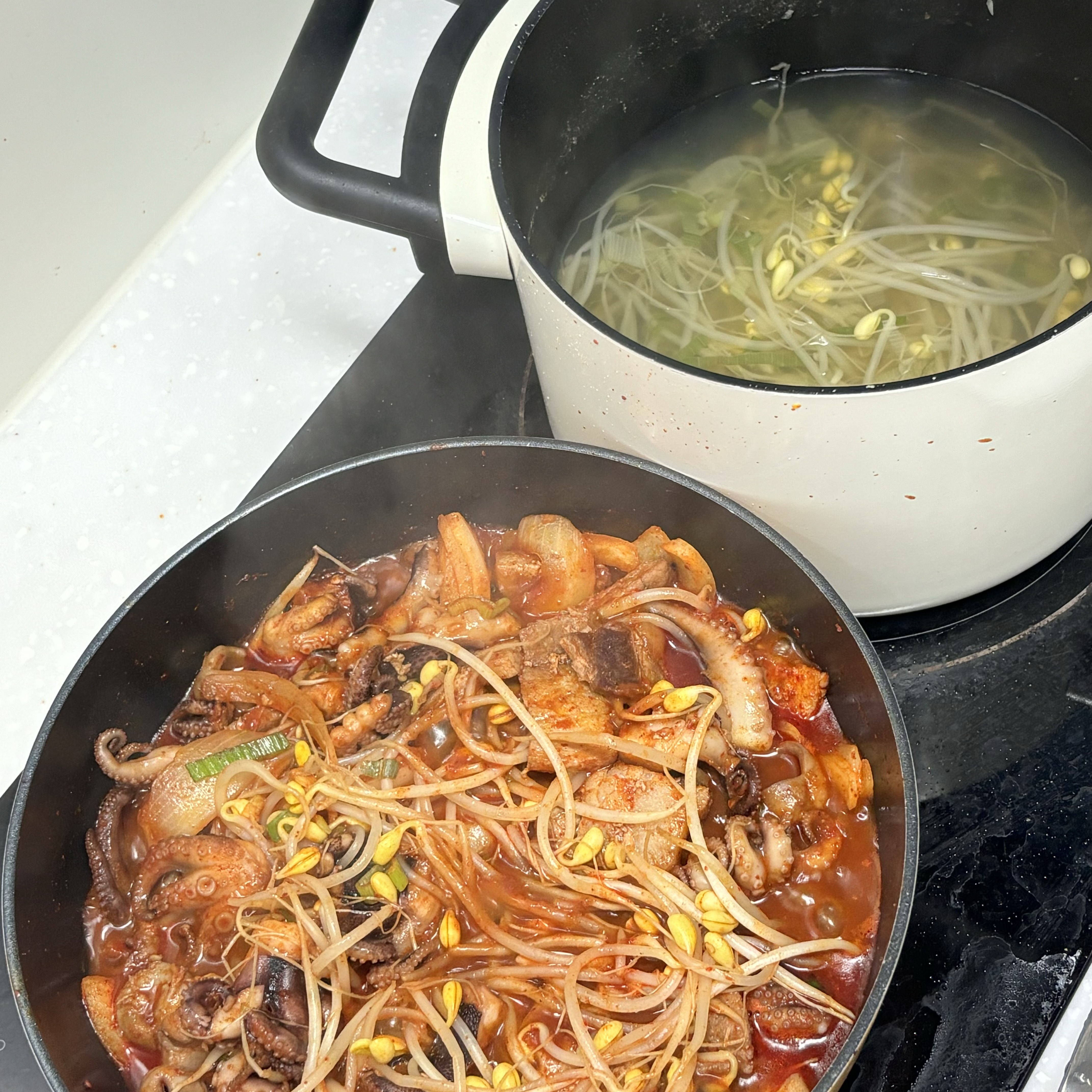 💡 남은 콩나물로는 간단한 콩나물국을 끓여서 곁들였어요. 매콤한 주꾸미와 시원한 국물 조합이 정말 잘 어울려요.