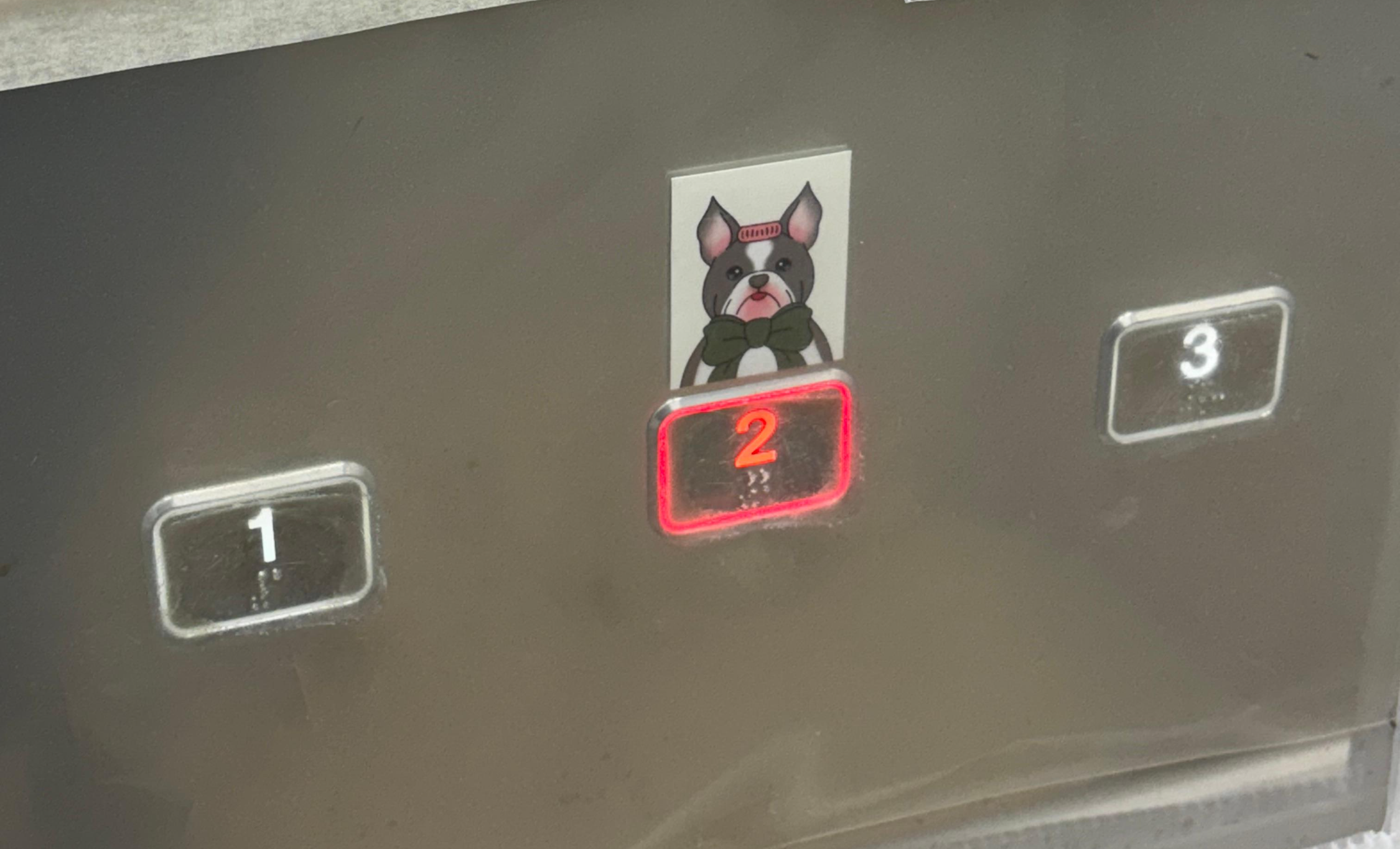- 2층 엘리베이터, 귀여운 강아지 스티커가 있는 버튼이 포인트