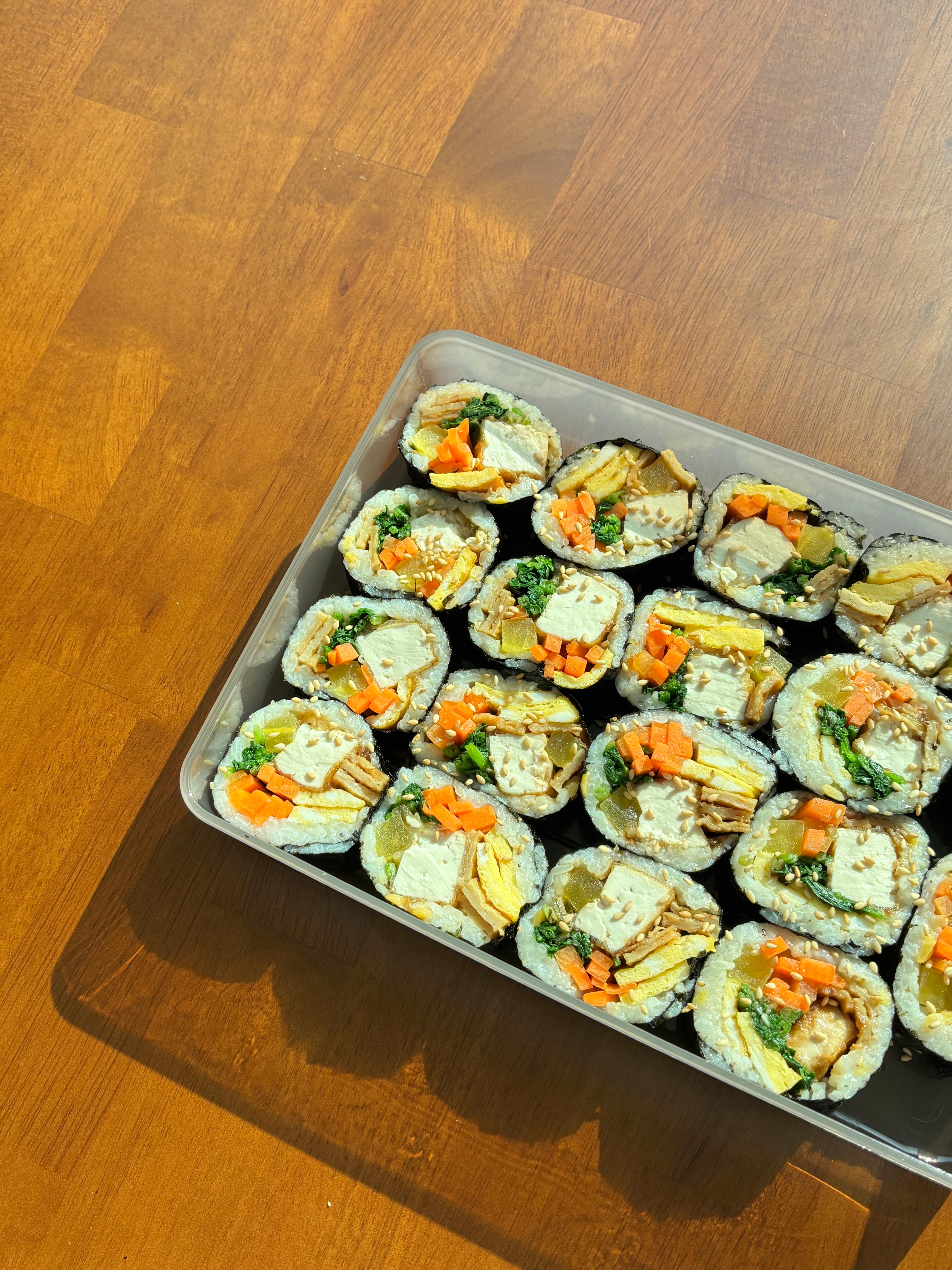 - 재료를 올리기 – 단무지, 계란, 당근, 시금치, 두부구이, 어묵을 차곡차곡