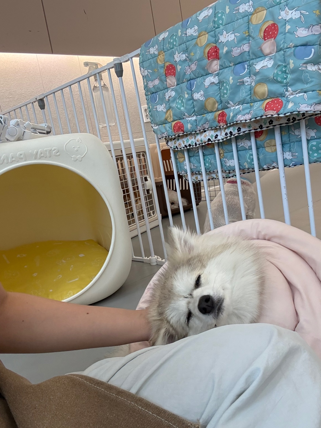 그런데 밤 9~10시 사이에 스카이동물의료센터 선생님이 다시 오셔서 아이들과 놀아주시고 배변활동도 시켜주신다고 해요.