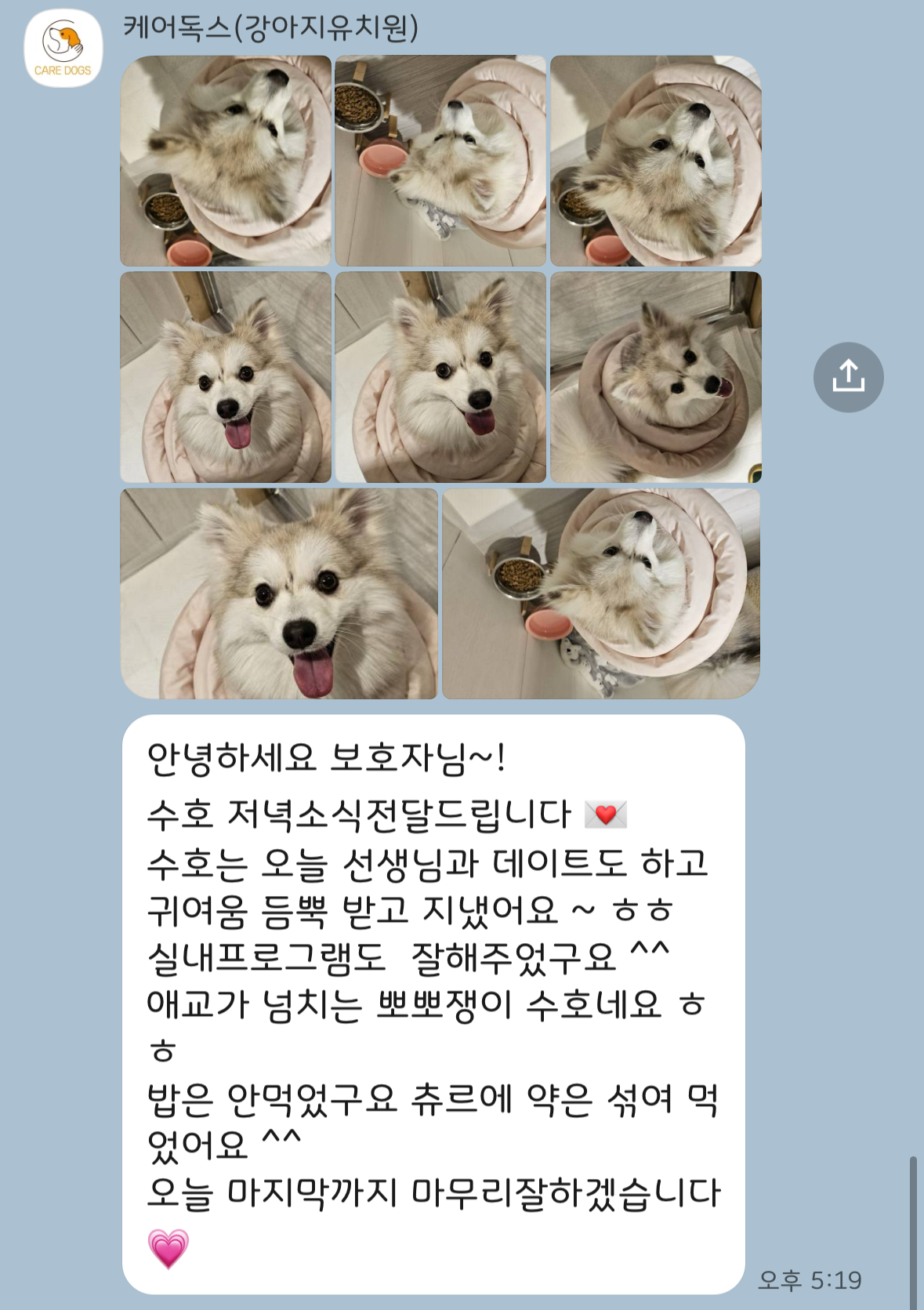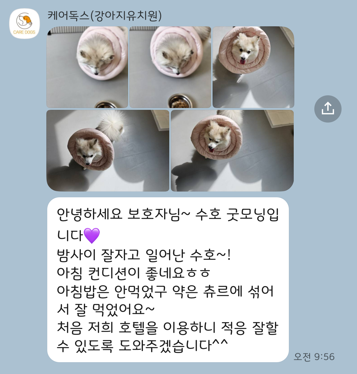 그래서 더 걱정이 많았는데 아침, 저녁 약도 꼼꼼히 챙겨주시고 문자로 하루 일과나 상태도 자주 안내해 주셔서 정말 안심하고 서울에서 볼일을 보고 올 수 있었답니다.