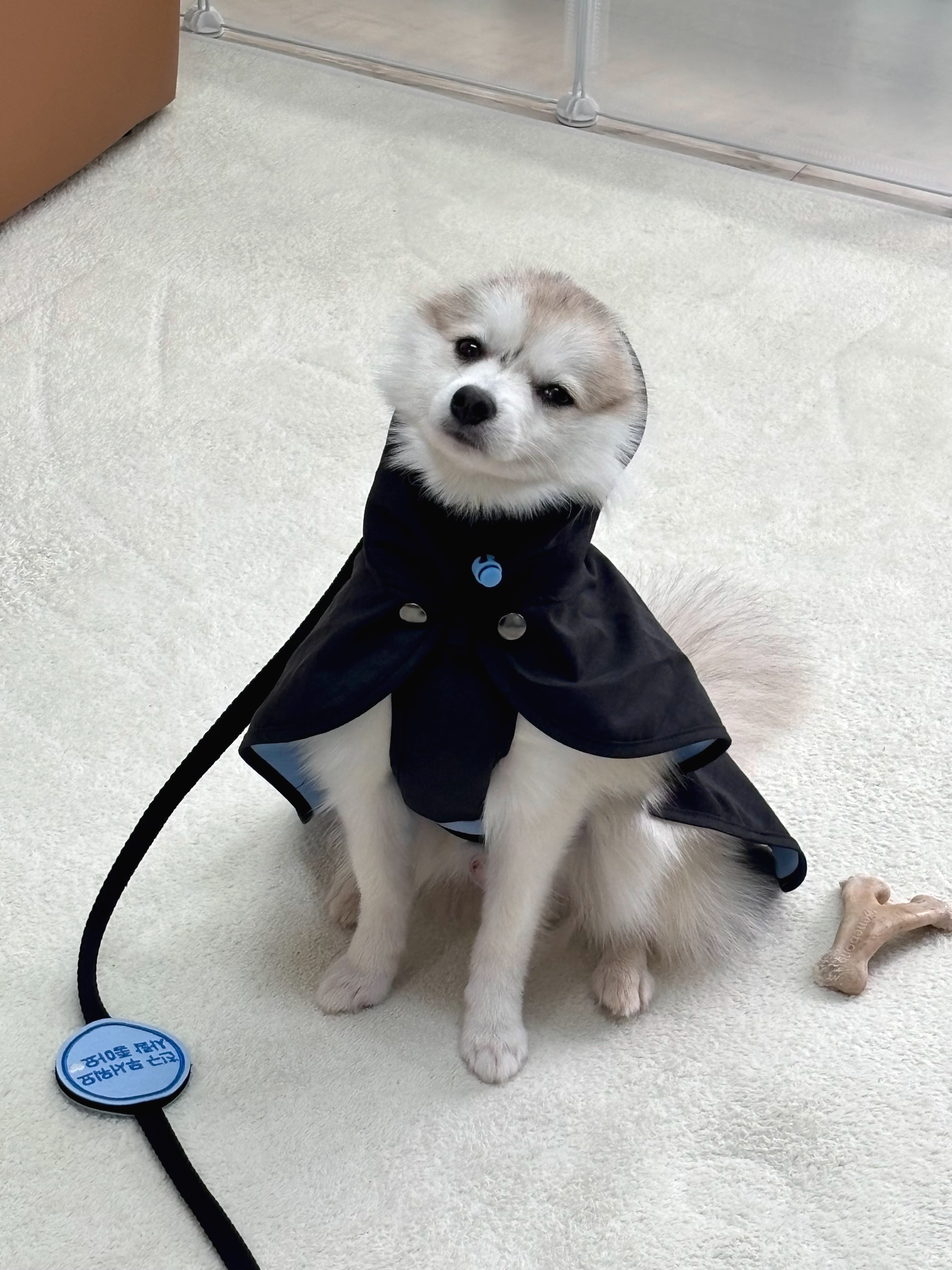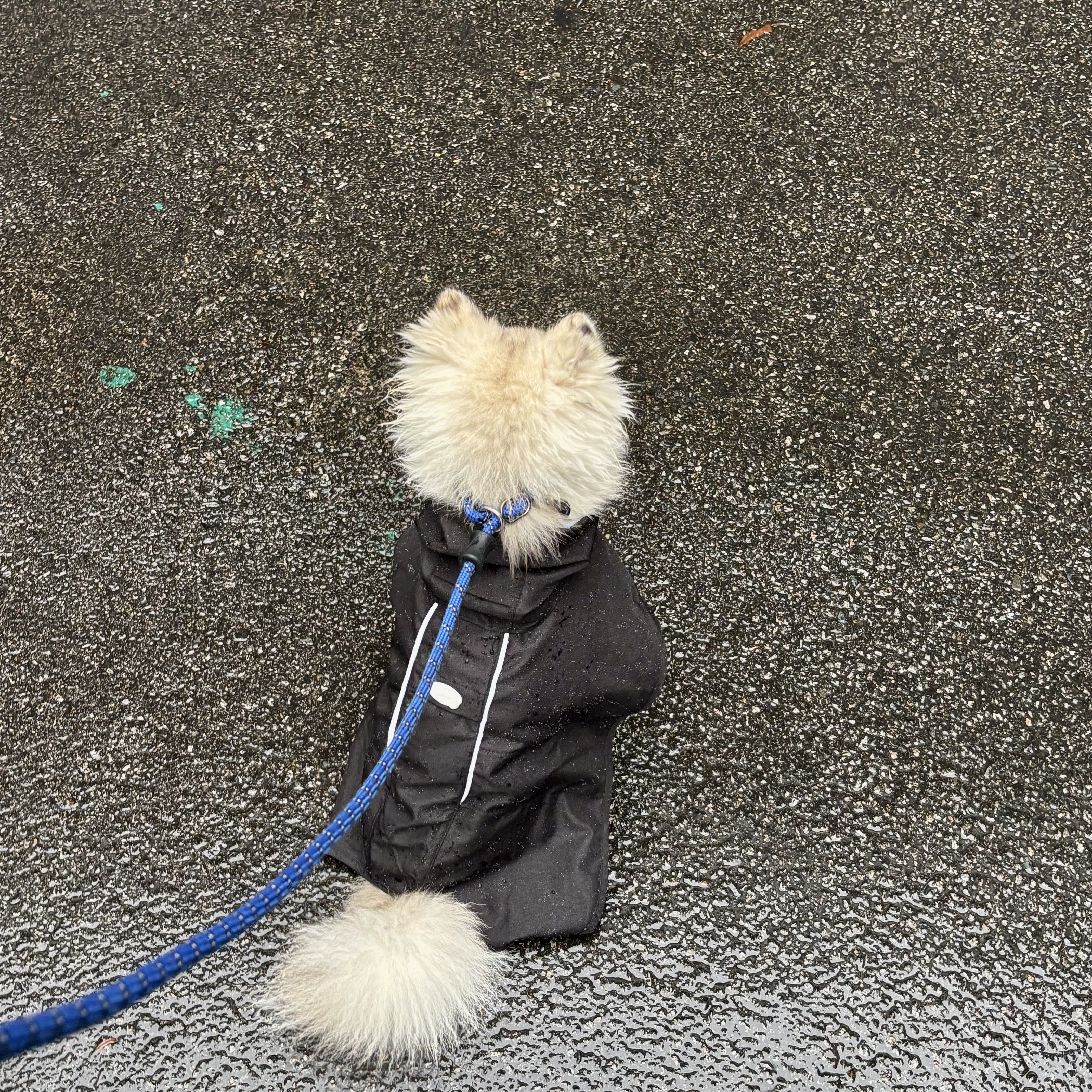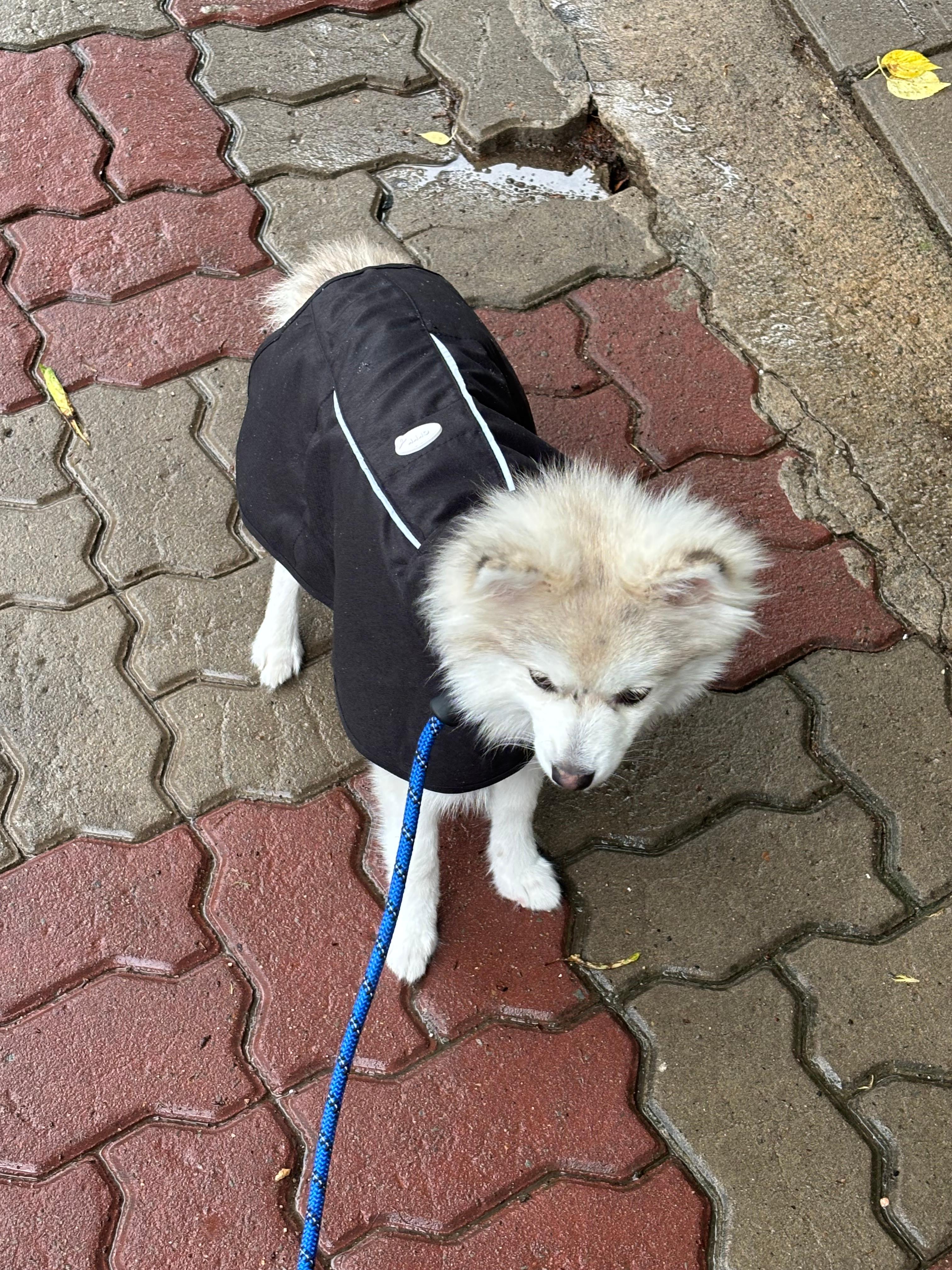 처음엔 후드가 살짝 어색했는지 갸우뚱했지만 막상 산책 나가니까 물 튀는 것도 막아주고 너무 잘 입고 다녔어요.