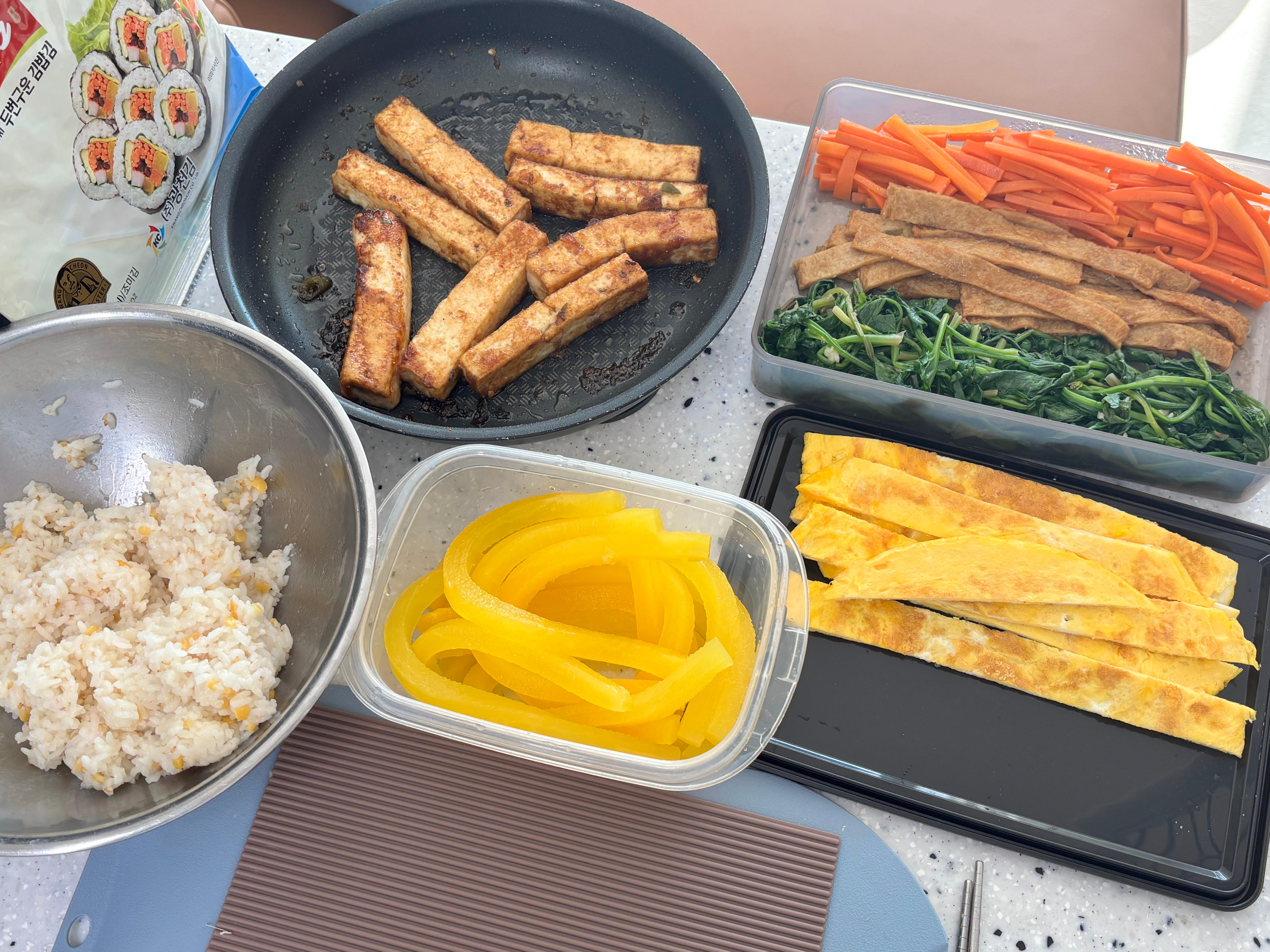 냉장고를 열어보니 김밥 속재료로 활용할 만한 것들이 꽤 있었어요.