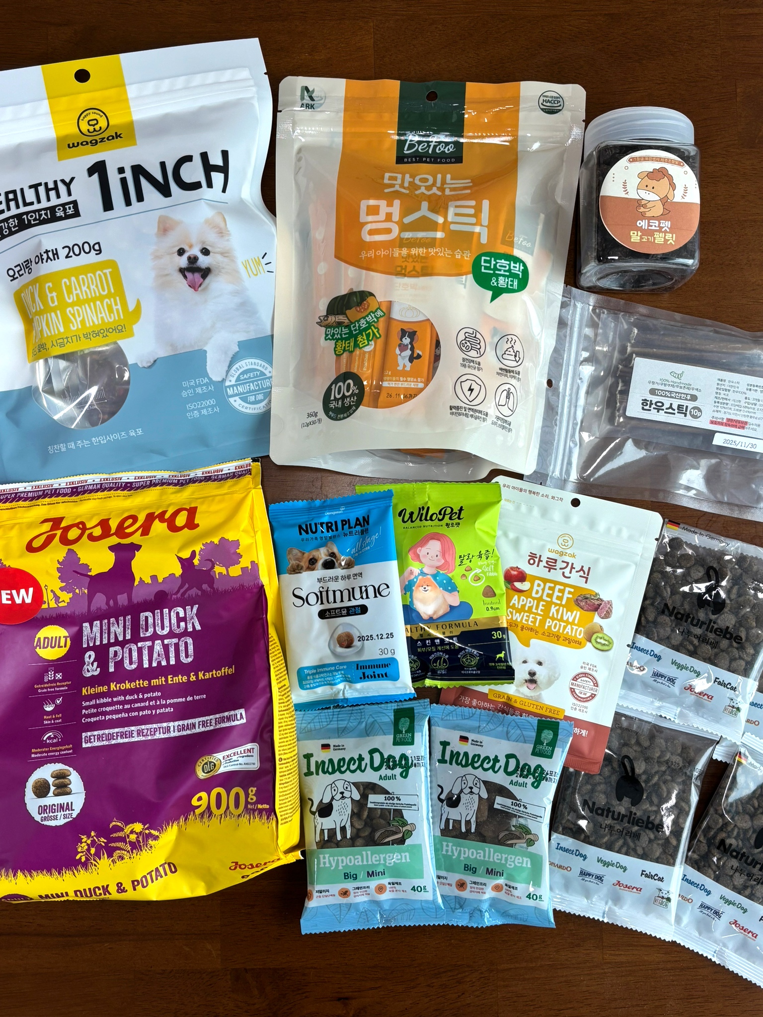 사료, 간식, 장난감, 의류, 유모차, 보험, 건강용품 등
