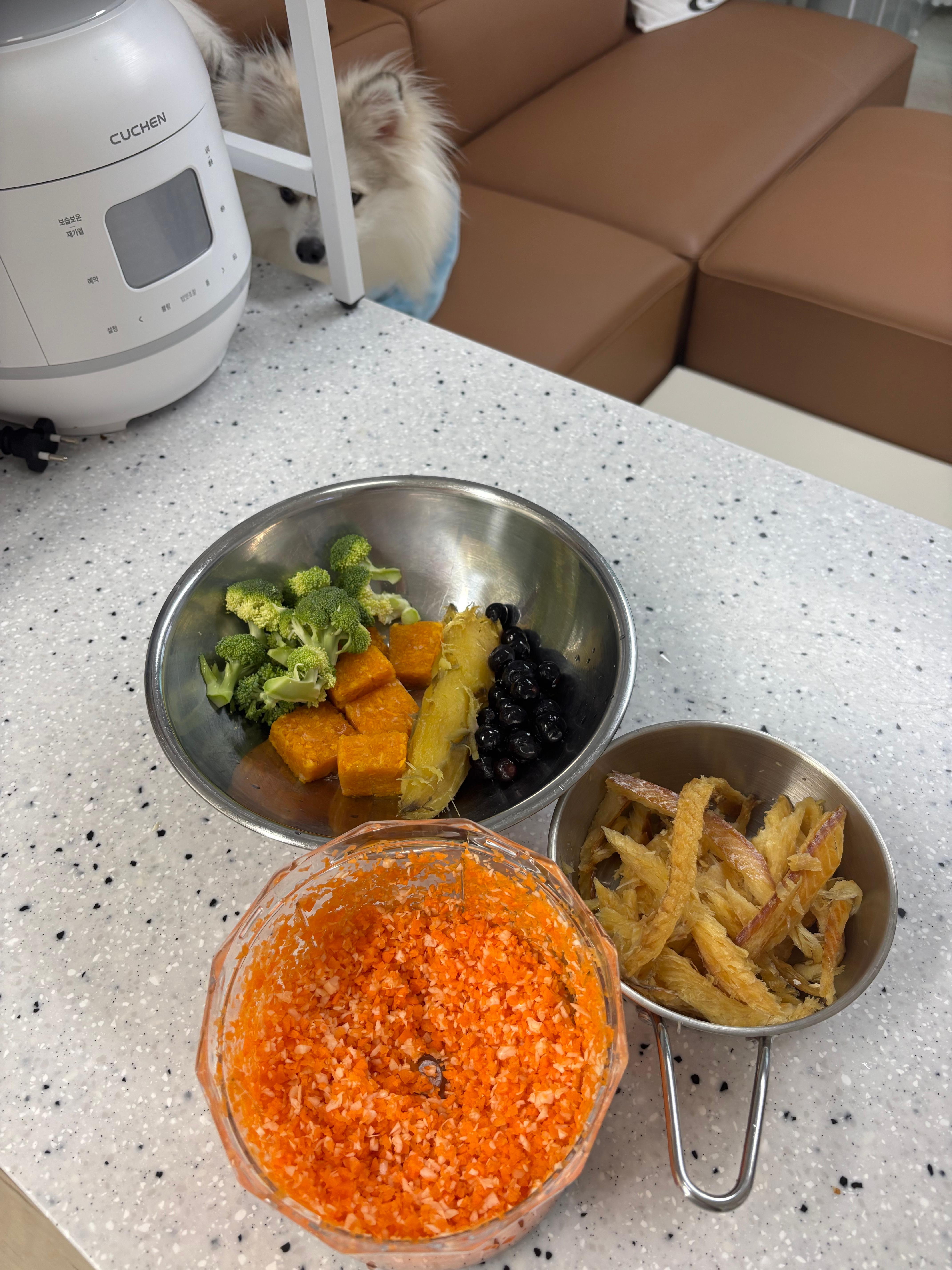 안녕하세요 :)오늘은 저희 반려견 수호를 위해 직접 만든 천연 수제 화식 레시피를 소개해 드리려 해요 💛시중 간식보다는 수호의 입맛과 건강을 고려해 집에서 만든 무첨가 수제 화식이 훨씬 믿음이 가더라고요.특히 노즈워크 장난감에 넣어주면 놀면서 영양까지 챙길 수 있어서 일석이조! 📌 해당 포스팅은 내돈내산 후기입니다.글 속 구매 경로를 통해 결제하실 경우 작성자에게 소정의 수익이 돌아올 수 있습니다.구매자분께는 추가 비용이 발생하지 않습니다.📦 준비 재료이번 화식은 3주치 분량으로 만들었어요.소형견(약 5kg 기준) 하루 1회, 30g씩 급여할 수 있도록 구성했습니다.재료총량역할🎃 다진 단호박 큐브100g부드러운 식감, 수분 보충, 소화 개선🍠 삶은 고구마150g단맛·포만감, 기호성 향상🥕 당근..